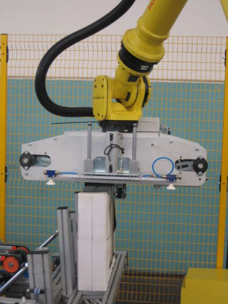 Robot controlled station for de-palletizing boxes of tiles. The system comes complete with a cutting system of the straps that binds the packs. It removes the in-between sheet placed between one layer of boxes and another and finally removes the empty pallet.