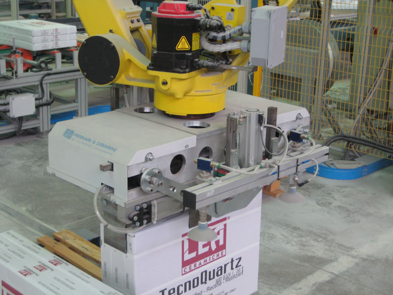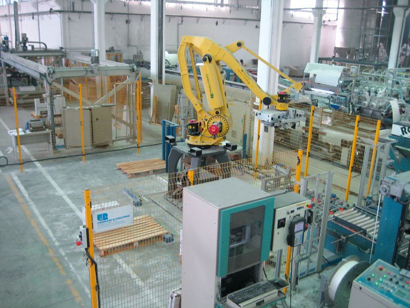 The robot controlled palletizer offers the advantage of working in extremly small spaces. The robot consist of a gripper that picks-up the boxes, suction cups that pick-up the in-between sheet of cardboard and pick-up device of the empty pallet. The whole process has a high productive rate of over 7 cycles per minute, plus the path movements are optimised.